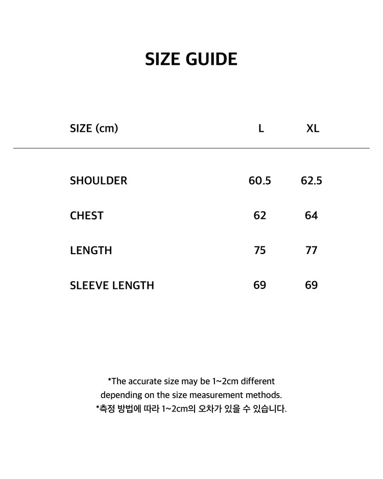 - 제품 공정 과정 중 발생할 수 있는 초크 자국, 실밥, 미세한 실측 차이, 패턴 불규칙 등은 불량으로 간주되지 않습니다.