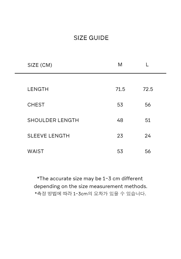 - 제품 공정 과정 중 발생할 수 있는 초크 자국, 실밥, 미세한 실측 차이, 패턴 불규칙 등은 불량으로 간주되지 않습니다.